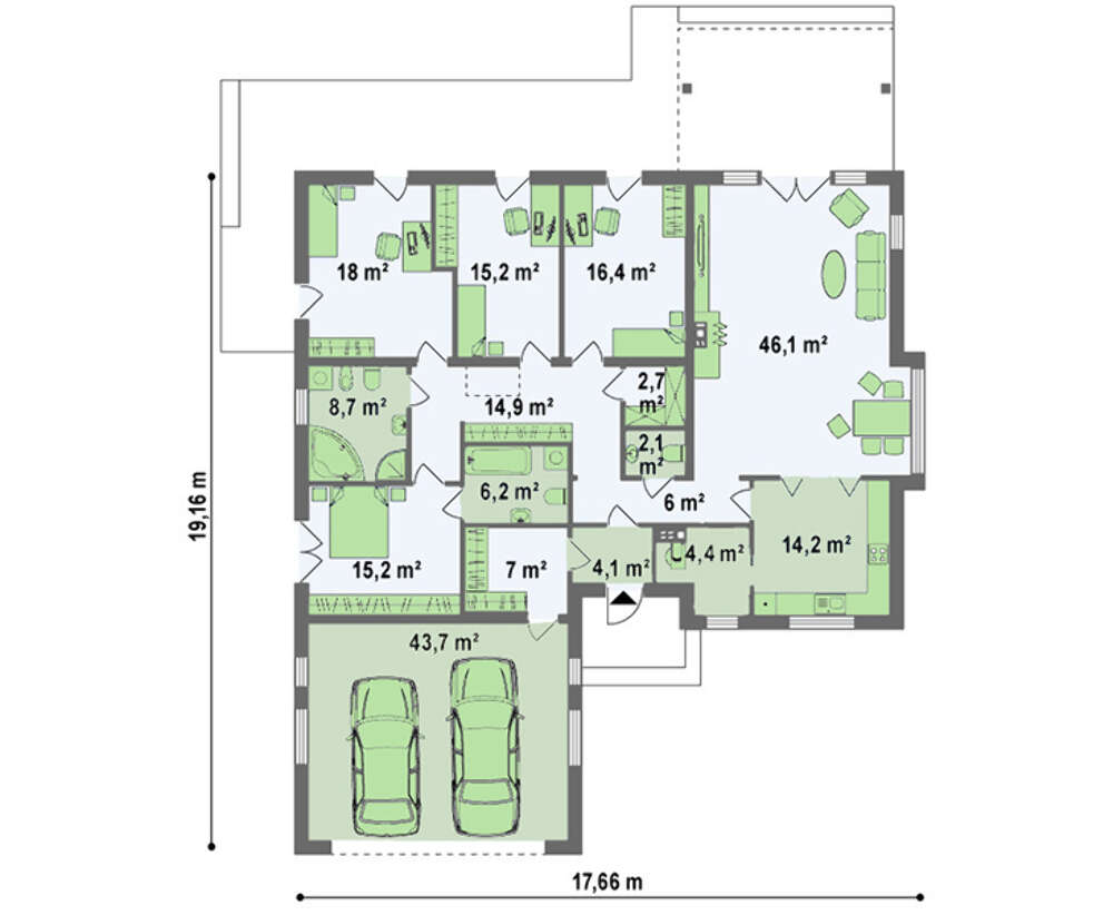 Проект удобного одноэтажного дома с гаражом для двух автомобилей
