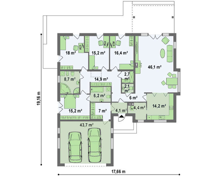 Проект удобного одноэтажного дома с гаражом для двух автомобилей 4M386