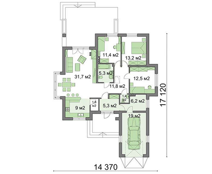 Внутреннее пространство разделено на три части. Центральный блок занимают жилые помещения. Три равные по площади спальни при выборе ставят жильцов в одинаковые условия. Отдельный санузел будет приятным дополнением.