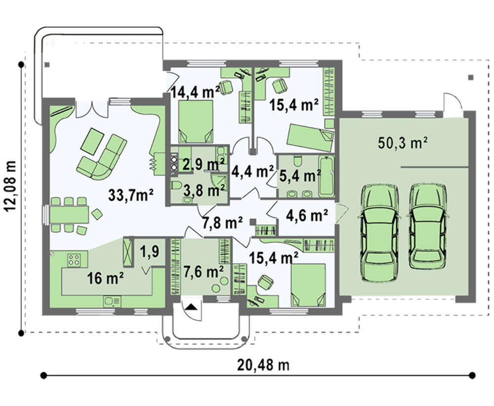 • 4M512 Проект одноэтажного дома с гаражом в классическом стиле для двух автомобилей