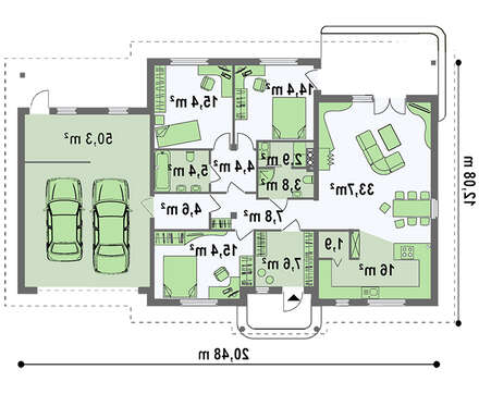 • 4M512 Проект одноэтажного дома с гаражом в классическом стиле для двух автомобилей