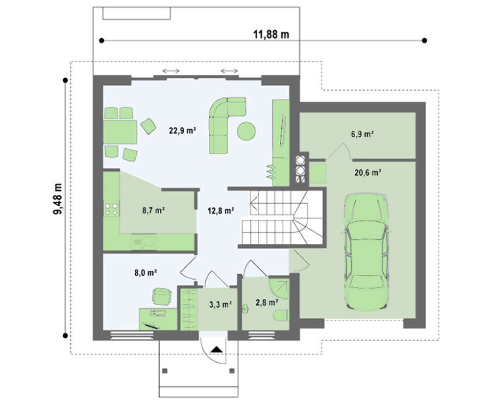 Проект одноэтажного дома с мансардой, гаражом и зеленой крышей