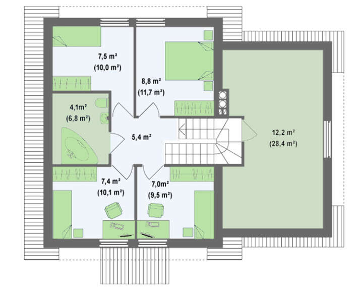 • 4M418 Проект одноэтажного дома с мансардой, гаражом и зеленой крышей