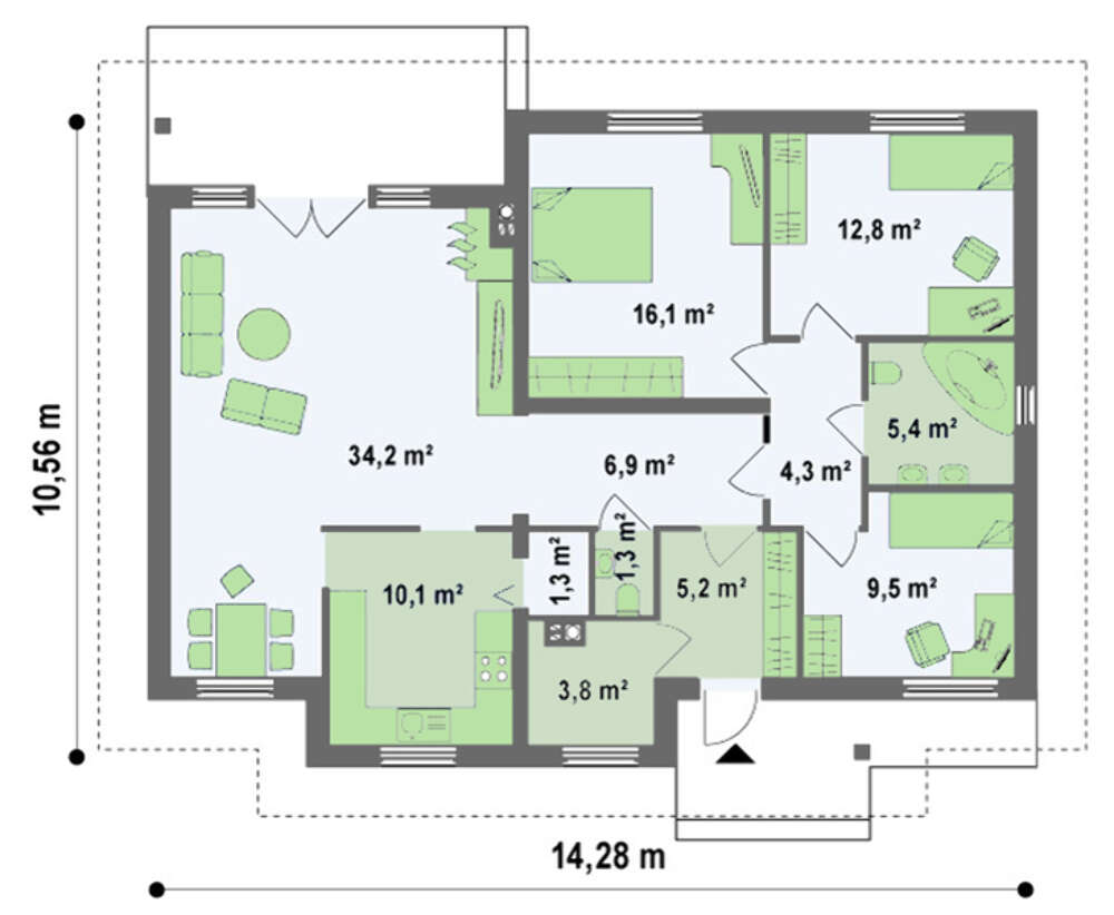 Проект  одноэтажного дома с многоскатной крышей как будто специально создан для небольшой современной семьи.