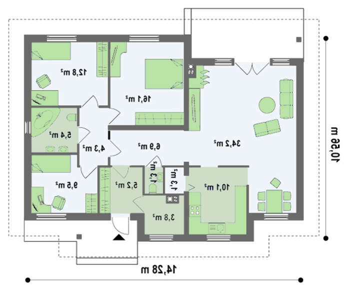 Проект одноэтажного дома с многоскатной крышей 4M228