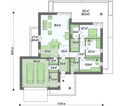 Проект одноэтажного дома с небольшим гаражом для 2 авто площадью 183 кв.м. 4M7027
