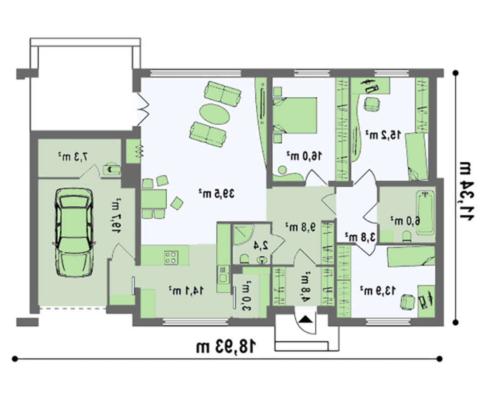 Проект одноэтажного дома с плоской крышей, со светлым функциональным интерьером и гаражом