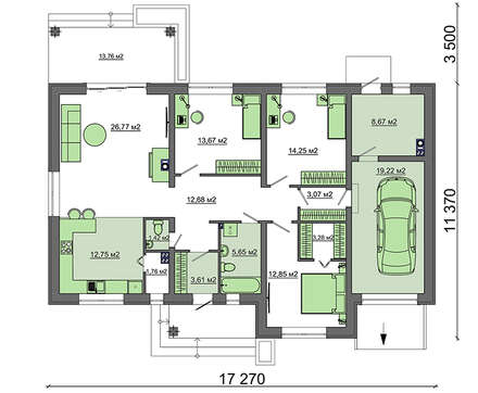 Компактный одноэтажный коттедж придется по вкусу многим застройщикам. Ввиду скромных размеров его можно поместить на небольшой участок, достаточно стандартных 6 соток. Этот проект выбирают для городского жилья, застройки в коттеджном поселке и в качестве частного домика. Его площадь достаточна для круглогодичного проживания среднестатистической семьи.