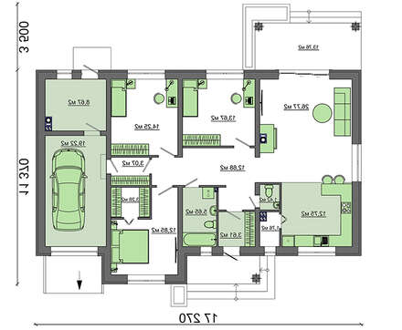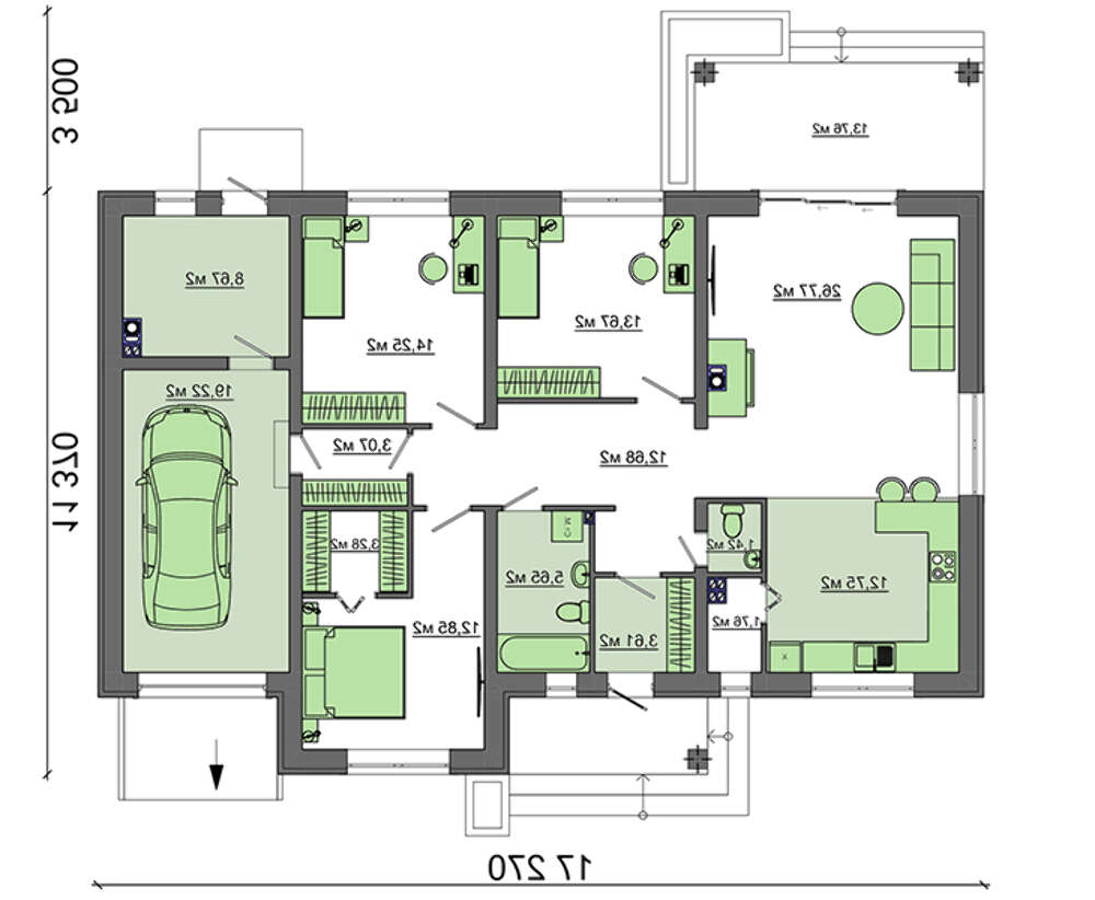 Компактный одноэтажный коттедж придется по вкусу многим застройщикам. Ввиду скромных размеров его можно поместить на небольшой участок, достаточно стандартных 6 соток. Этот проект выбирают для городского жилья, застройки в коттеджном поселке и в качестве частного домика. Его площадь достаточна для круглогодичного проживания среднестатистической семьи.