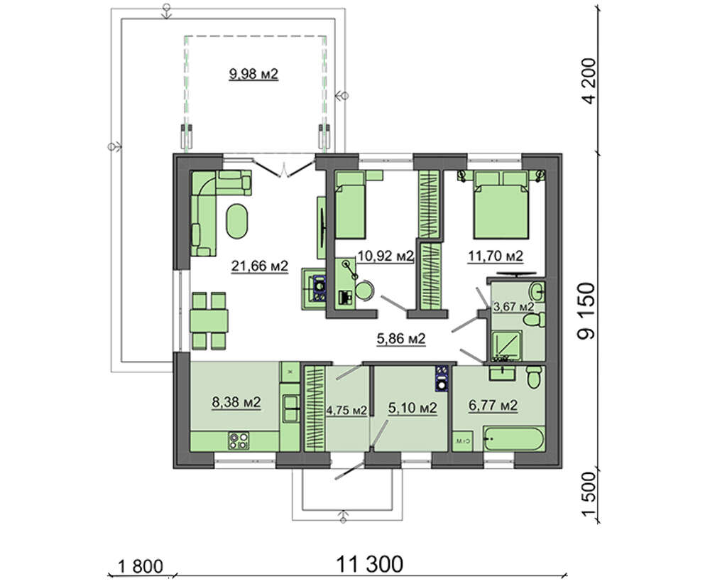 Проект содержит три раздела – АрхитектурныйКонструктивный и Инженерный: водоснабжение, отопление, вентиляция, канализация, электроснабжение (приобретается за дополнительную плату) + Пояснительная записка.