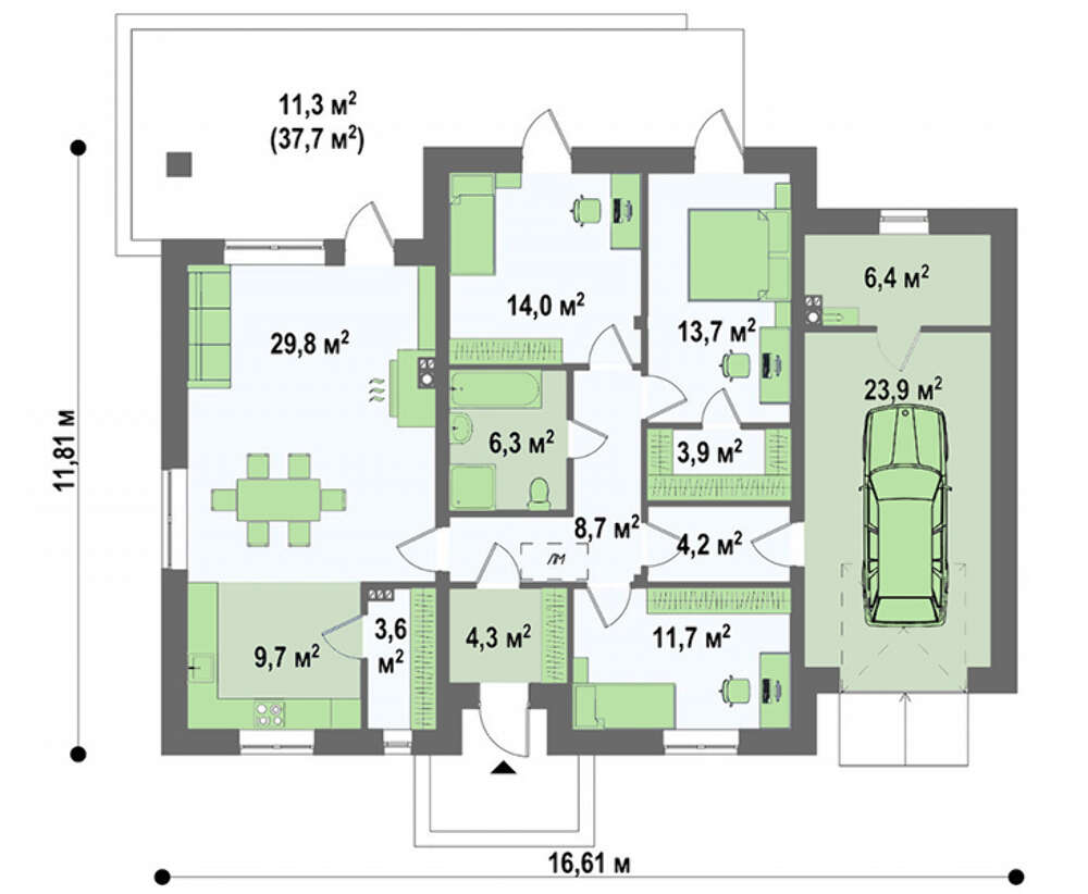 • 4M7041 Проект одноэтажного классического дома с гаражом площадью 151 кв.м