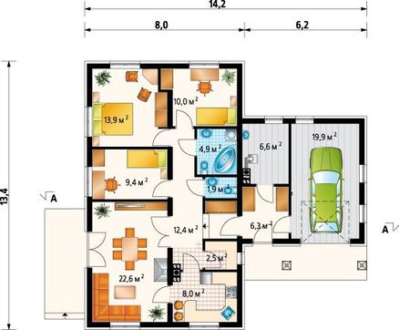 Проект одноэтажного коттеджа на 118 кв. м с пристроенным блоком технических помещений
