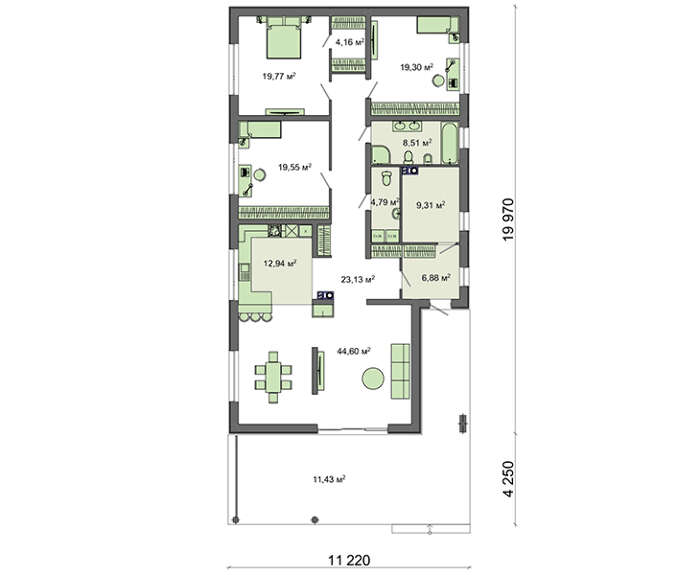 Для того чтобы внести разнообразие в отдых и сделать его более насыщенным, предусмотрен отдельный выход на террасу прямо из гостиной. Личное пространство включает три спальни, соединенные через коридор. Комнаты просторные, имеют практически одинаковые размеры. Хозяйские апартаменты относятся к более комфортным за счет личного гардероба. К дополнительным помещениям относится гардеробная, которая может быть использована для хранения инструмента или в качестве мастерской.