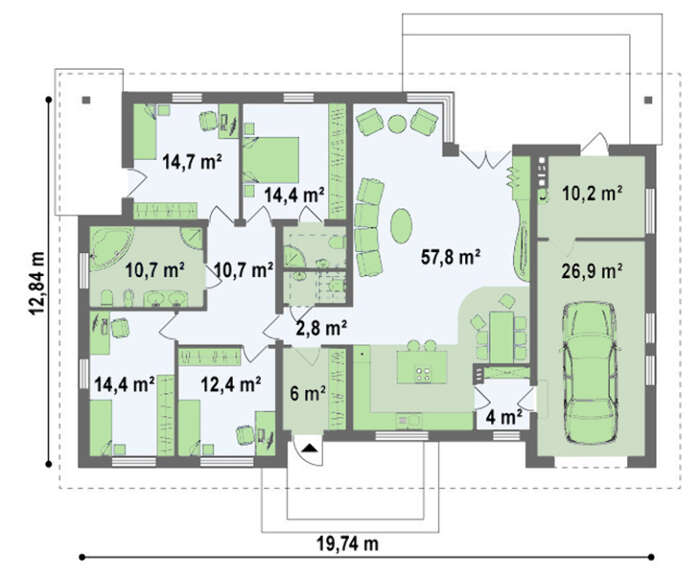Проект одноэтажного коттеджа с 4 спальнями 4M070