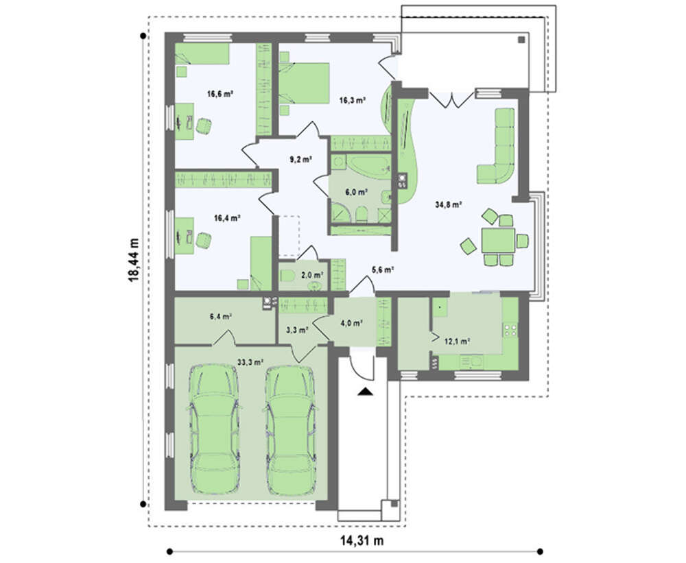 Проект одноэтажного коттеджа с гаражом для двух автомобилей