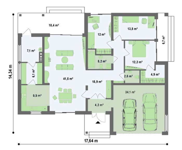 Проект одноэтажного коттеджа с гаражом и крытой террасой