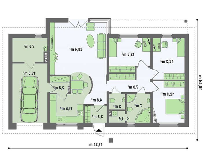 Если вы цените порядок и точно знаете, где и что находится в вашем хозяйстве, то проект одноэтажного дома с гаражом и приватной зоной ваш точно понравится. Рациональная организация пространства и четкое деление дома на функциональные зоны вам придутся по душе.
