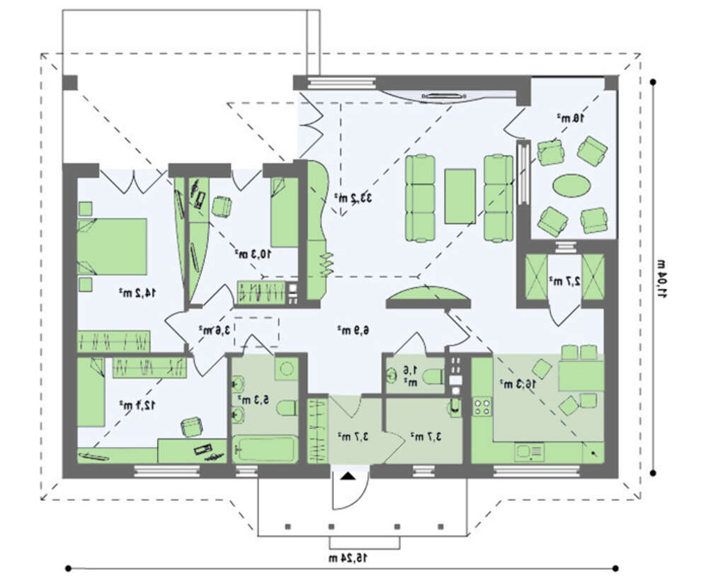 Проект одноэтажного дома с оранжереей и террасой представляет собой простой и экономичный вариант загородного жилья для современной семьи из четырех человек.