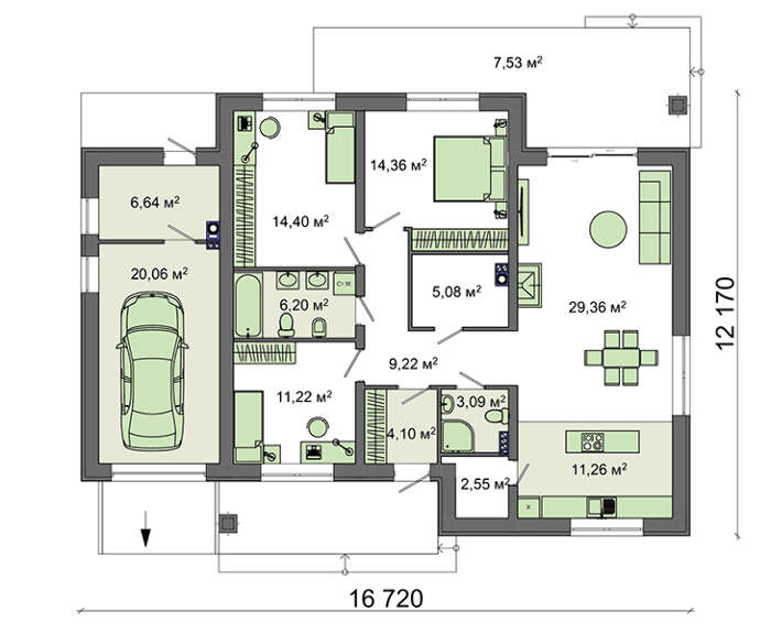 Основным достоинством проекта одноэтажного дома с предусмотренной мансардой можно смело назвать сочетание комфорта и функциональности. Такой дом станет достойным жильем для молодой семьи.