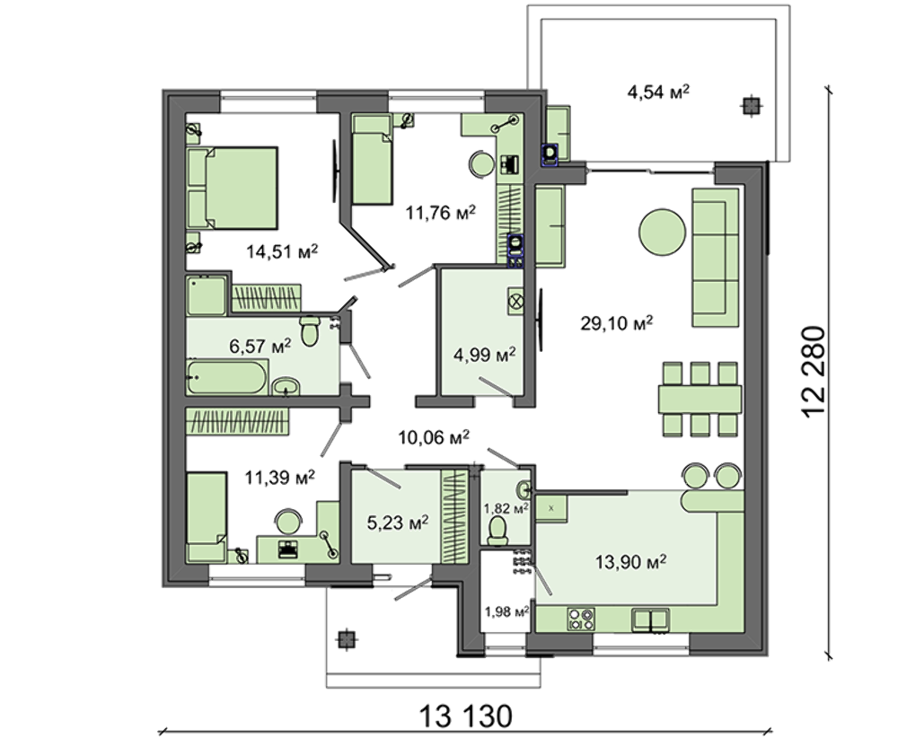 Проект одноэтажного коттеджа с тремя спальнями и двускатной крышей 4M414