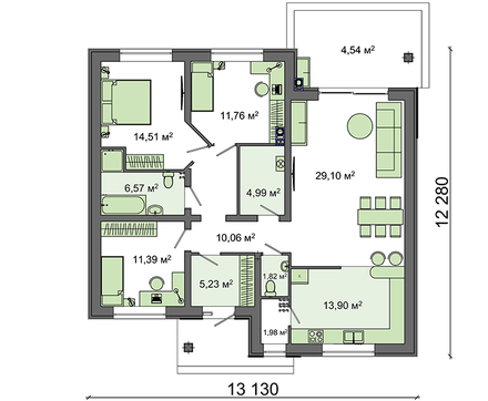 Проект одноэтажного коттеджа с тремя спальнями и двускатной крышей