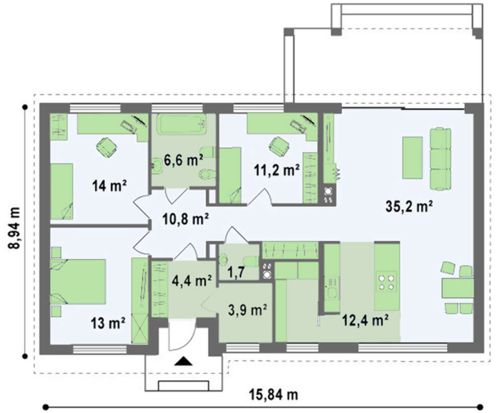 Одноэтажные дома всегда актуальны. Несмотря на то, что все больше в моду входят мансарды и двух-трех этажные дома, небольшие домики в один этаж остаются все также востребованными. Не все приемлют лестницы и ступеньки. Кому-то по ним сложно подыматься, а кому-то они просто не нравятся. Домик 4М618 – удобный и комфортный, в котором вся  полезная жилая площадь разместилась на одном этаже.