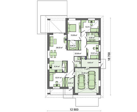 Несмотря на небольшие размеры, в пространстве коттеджа поместились все необходимые для комфорта помещения. Планировкой дома предусмотрен широкий гараж, куда можно поместить на хранение два автомобиля. Прилегающее помещение топочной удобно использовать для размещения инструмента и запчастей, места достаточно для организации мастерской.