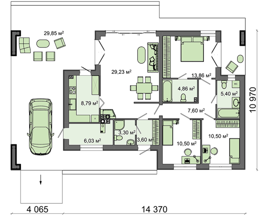 • 4M607 Проект одноэтажного стильного дома хай - тек с бассейном и гаражом на одну машину