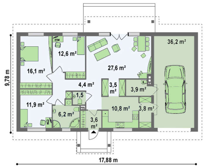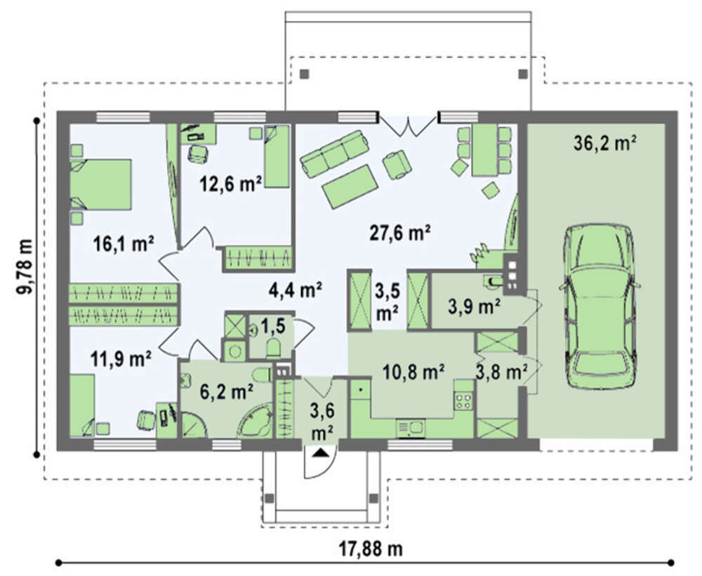 Проект одноэтажного загородного коттеджа с гаражом 4M524G