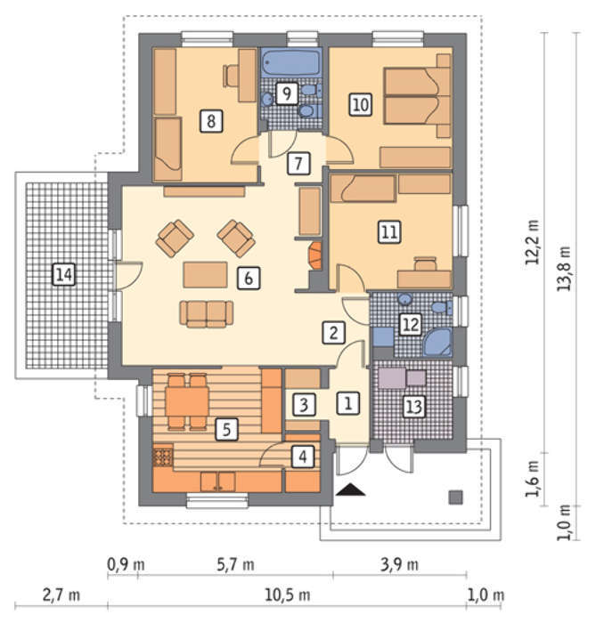 Одноэтажный жилой дом с просторной кухней-столовой прекрасно впишется в любой городской пейзаж. Использованные для окраски серые и коричневые цвета выглядят благородно, свидетельствуют о высоком статусе и хорошем вкусе хозяина. Красивая яркая кровля добавляет шика. Для декора использованы панели с горизонтальными перекладинами, выкрашенные в тон стенам. На время отдыха имеются две уютные веранды с полутенью, одна из которых с элегантной колонной.