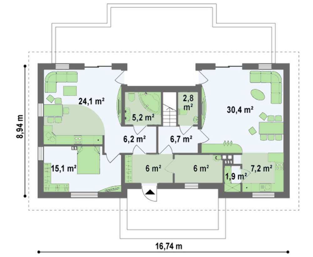 • 4M264 Проект практичного коттеджа с мансардой и удобным балконом