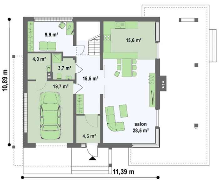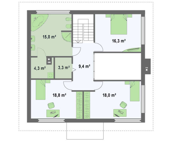 Над комфортной дневной зоной спроектирована антресоль. Поэтому обширное пространство, образованное гостиной, столовой и кухней буквально залито солнечным светом. Между рекреативной и столовой зонами находится камин. Кстати, он может быть двусторонним. И тогда замечательные шашлыки на закрытой веранде вам обеспечены. А можно просто организовать обед на свежем воздухе. Благо из гостиной и кухни можно спокойно выйти на террасу. Дополнительная комната, в которой можно обустроить кабинет или гостевую спальню, удачно дополняет пространство первого этажа.