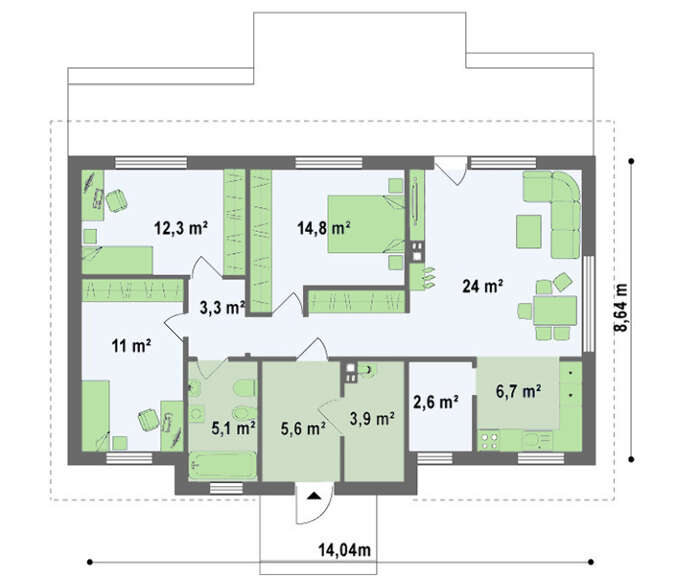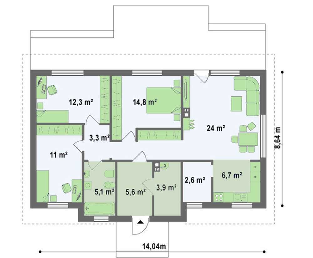 Проект содержит три раздела – АрхитектурныйКонструктивный и Инженерный: водоснабжение, отопление, вентиляция, канализация, электроснабжение (приобретается за дополнительную плату) + Пояснительная записка.