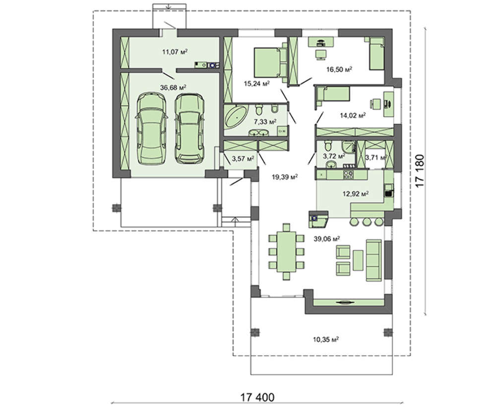 Проект роскошного жилого дома с тремя спальнями будет интересен членам большой семьи, которые предпочитают жить в масштабах одного уровня и рады много времени проводить вместе. При организации внутреннего пространства большое внимание уделено комнатам общего времяпрепровождения, им отведена большая часть площади.