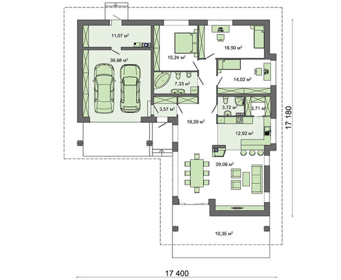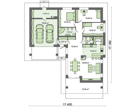 Гараж просторный, рассчитан на два автомобиля. Место позволяет организовать стеллажи для хранения инструмента и запчастей, построить мастерскую для слесарных работ. Гостиная выполнена в виде студии, включает место отдыха, приготовления пищи и столовую. Центральную часть занимает камин, которые не только служит дополнительным источником тепла, но и зонирует пространство. С его помощью кухня частично изолирована, а пищевые запахи не нарушают покой отдыхающих. Зона приготовления блюд включает дополнительную площадь для хранения провианта и бытовой техники.