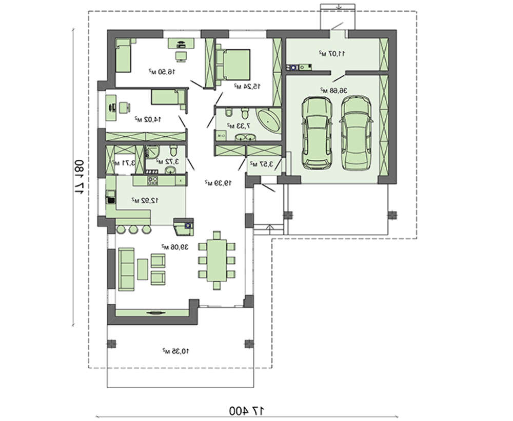 Гараж просторный, рассчитан на два автомобиля. Место позволяет организовать стеллажи для хранения инструмента и запчастей, построить мастерскую для слесарных работ. Гостиная выполнена в виде студии, включает место отдыха, приготовления пищи и столовую. Центральную часть занимает камин, которые не только служит дополнительным источником тепла, но и зонирует пространство. С его помощью кухня частично изолирована, а пищевые запахи не нарушают покой отдыхающих. Зона приготовления блюд включает дополнительную площадь для хранения провианта и бытовой техники.