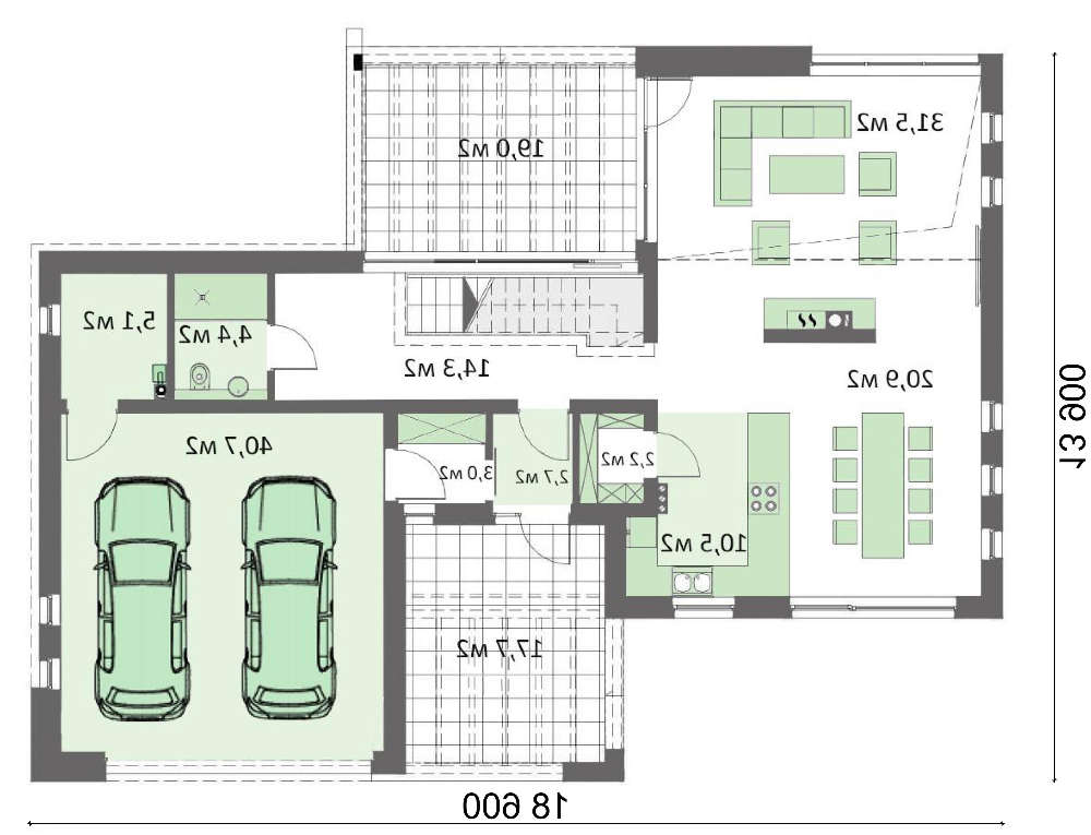 Жилое пространство первого этажа максимально удалено от просторного гаража на два авто. Планировка направлено на создание максимальной тишины для отдыхающих членов семьи. Дополнительная комната первого этажа может быть использована как мастерская для выполнения сервисных работ.