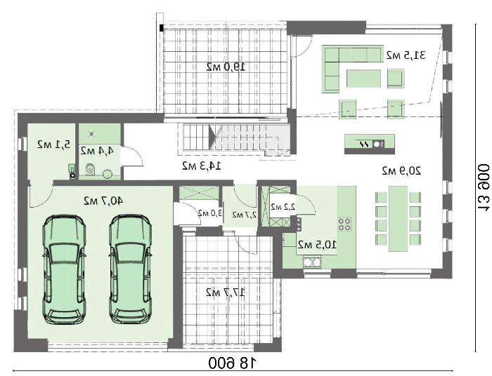 При проектировании особое внимание уделено созданию открытых пространств, заполненных солнцем. Гостиная объединила вместе столовую, кухню и зону отдыха. Примыкающее к кухне подсобное помещение идеально подходит для хранения инвентаря и пищевых продуктов.