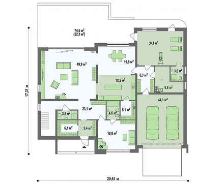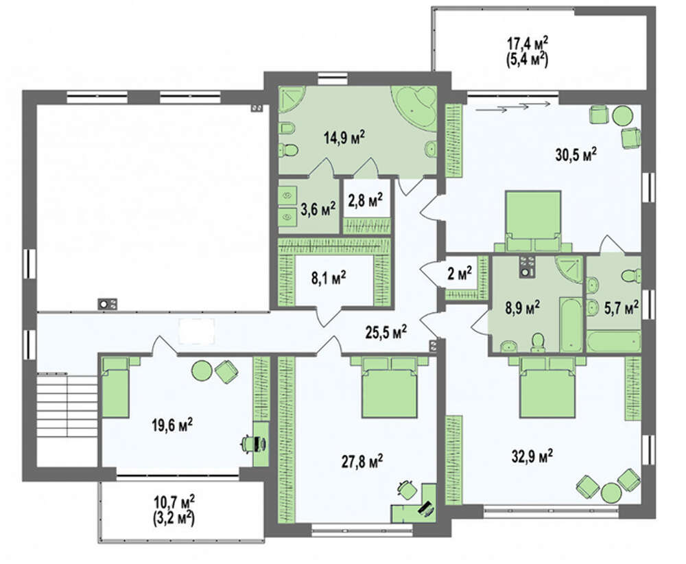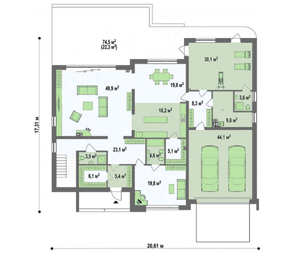 Проект содержит три раздела – АрхитектурныйКонструктивный и Инженерный: водоснабжение, отопление, вентиляция, канализация, электроснабжение (приобретается за дополнительную плату) + Пояснительная записка.