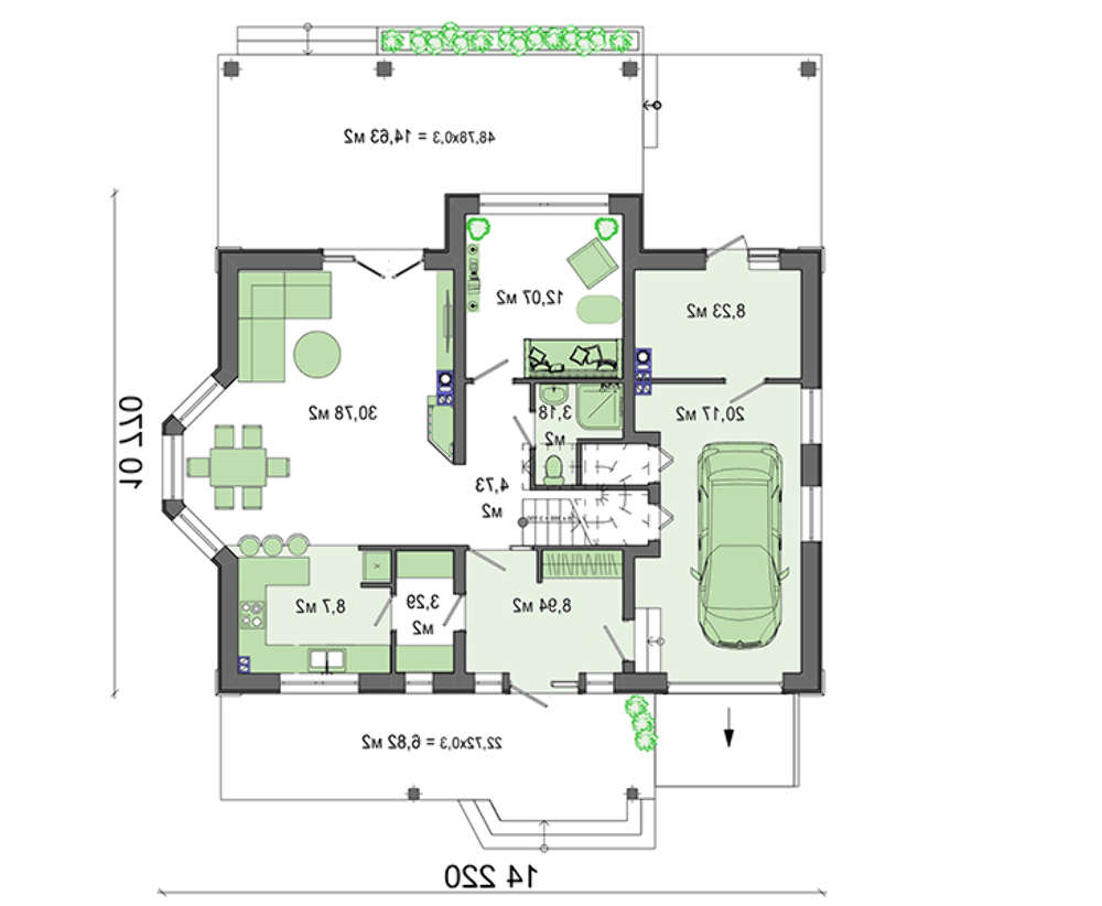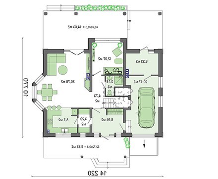 Почти половина первого этажа отведена под студию. Огромное пространство получено при соединении гостиной, столовой и кухни. Центральную эркерную часть рекомендуется использовать под зону приема пищи, тогда ваши обеды и ужины будут постоянно проходить в окружении живописных пейзажей природы. Небольшой, но достаточный для размещения одного автомобиля, гараж надежно укроет от атмосферных осадков транспорт. Здесь же имеется отдельная комната, в которой можно хранить инструменты и выполнять ремонтные работы.