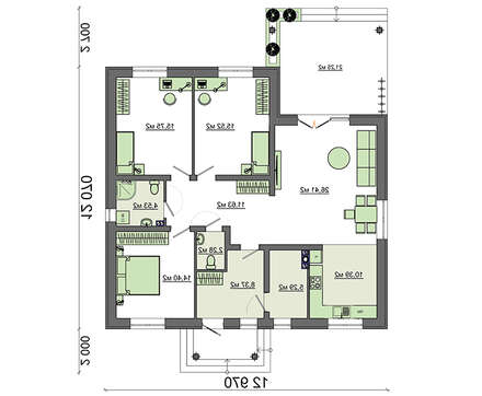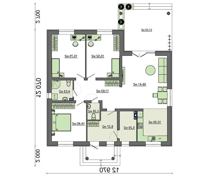 Проект содержит три раздела – Архитектурный, Конструктивный и Инженерный: водоснабжение, отопление, вентиляция, канализация, электроснабжение (приобретается за дополнительную плату) + Пояснительная записка.