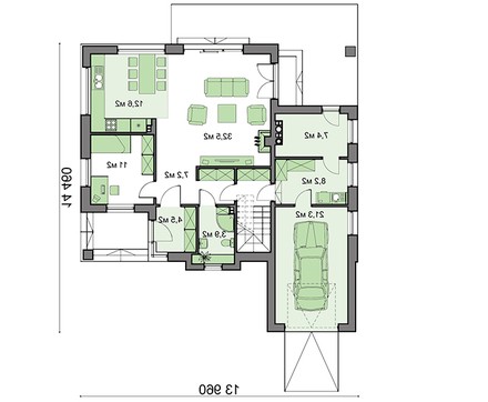 На первом этаже представлены помещения разного назначения. Площадь гаража рассчитан на хранение одной единицы транспорта. Предусмотрено место для размещения мастерской. Кухня, столовая и гостиная объединены в общую студию. Обеденный стол приближен к месту для приготовления пищи, такая планировка помогает хозяйке экономить время на создание кулинарных шедевров и сервировку праздничных трапез.