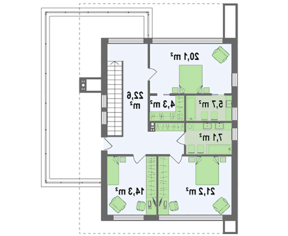 Скромно, вдоль стены, прислонилась лестница. Второй этаж, как и первый, полон света. Хозяйская спальня-каюта имеет гардеробную и ванную комнату. Но в этом «космическом корабле» найдется место и для гостей. Для них подойдут еще две спальные комнаты и просторная ванная. За лесенкой на втором этаже спрятался выход на террасу, которая удачно разместилась на крыше гаража.