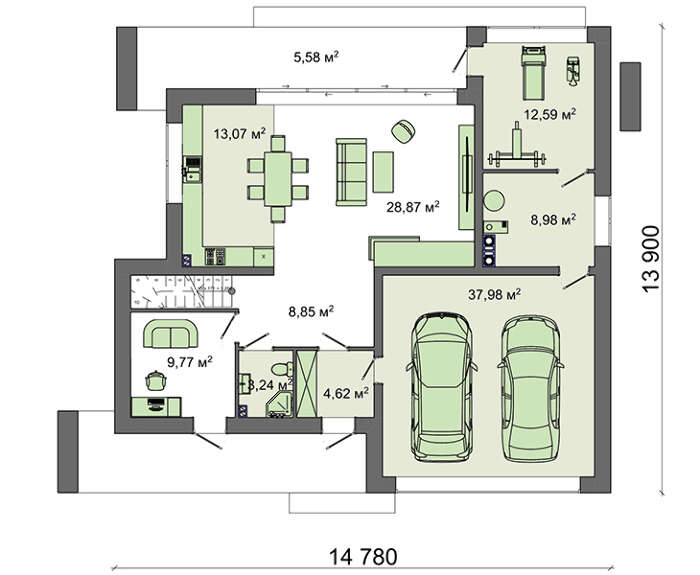 Первый этаж определен как зона бодрствования. Внушительную часть площади занимает просторный зал, выполняющий функции гостиной, столовой и кухни. Здесь жильцы дома могут проводить максимальное количество свободного времени.
