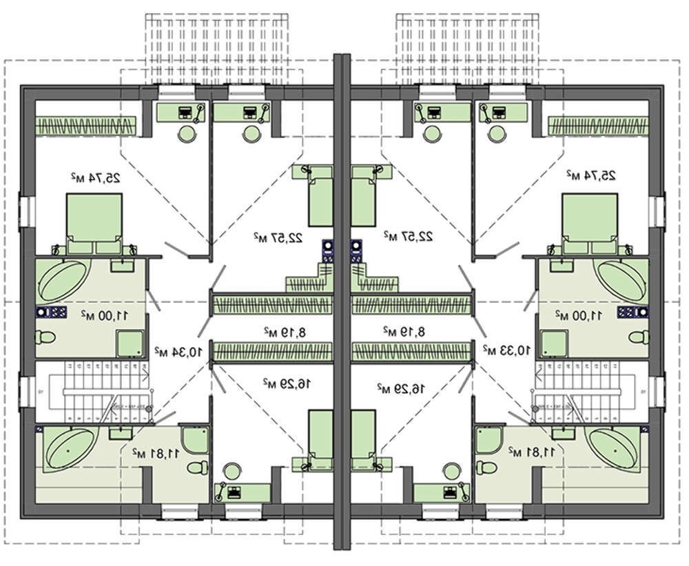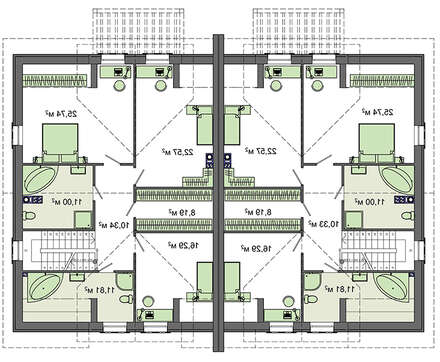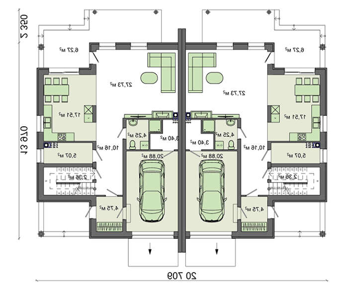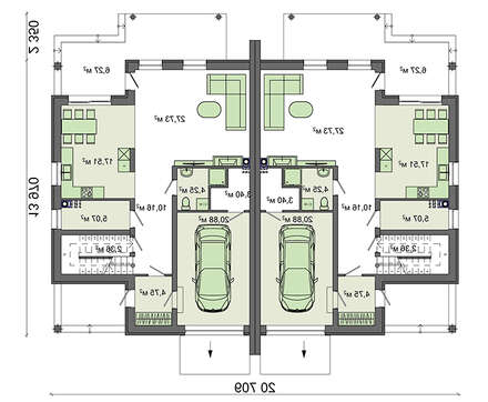 План стильного коттеджа общей площадью 416 кв. м можно использовать для строительства большого дома на две семьи. По факту он представляет две двухэтажные квартиры симметричного исполнения с отдельными приусадебными участками. В проекте предусмотрена возможность в хорошую погоду большую часть свободного времени проводить на свежем воздухе, для чего имеется небольшое крылечко и просторная веранда. Полученного места достаточно для создания зоны отдыха с шезлонгами и мягкой мебелью.