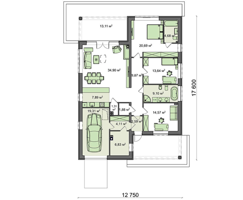Жилая зона объединила три спальни разной площади, санузел с гидробоксом и массажной ванной. К техническим помещениям относится гараж для хранения автомобиля и котельная. Последнюю можно использовать под домашнюю мастерскую.