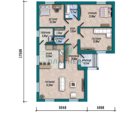 Проектировщики постарались в одном уровне поместить все необходимые для комфортного проживания помещения. Гостиная занимает солидную площадь в 41 кв. м, к которой примыкает кухня в 10 квадратов. Сложная Г-образная форма помогает подальше раздвинуть места разного назначения, теперь здесь можно отдыхать, готовить пищу и принимать гостей не мешая друг другу. С кухни легко попасть в топочную, помещение которой дополнительно можно использовать для хранения пищевых продуктов и бытовой техники.