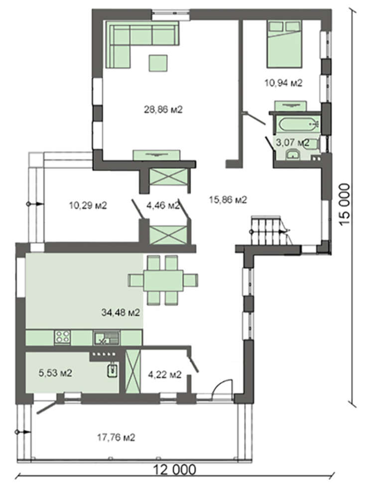 При проектировании первого этажа отошли от практики объединения в единую студию всех помещений. Под гостиную выделена отдельная солидная площадь. Панорамные окна наполняют помещение светом и простором, создают шикарный вид, позволяют здесь хозяйничать солнечным лучам, способствуя созданию великолепной гостиной.