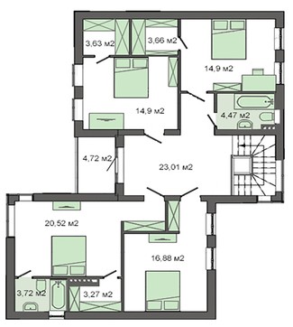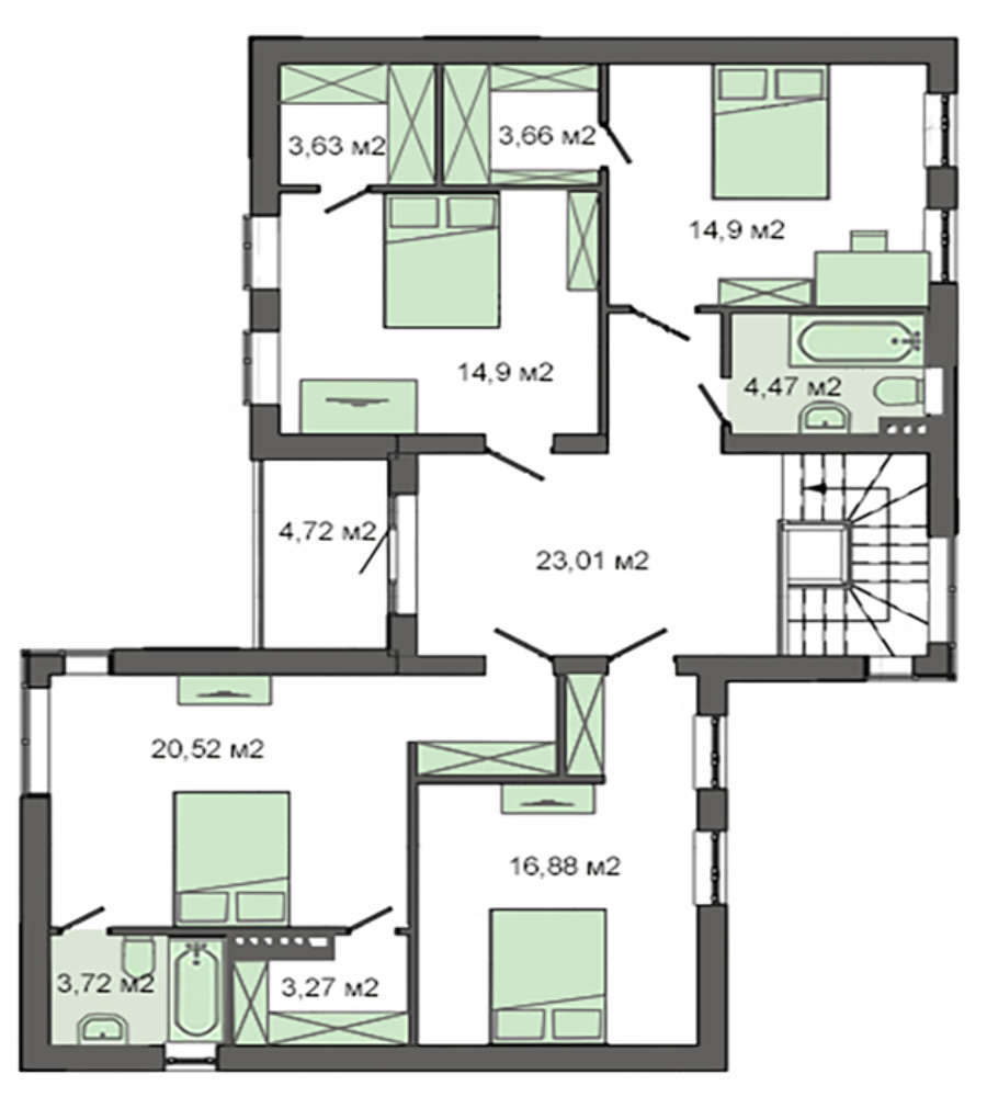 Второй этаж – зона повышенного комфорта. Три спальни способны удовлетворить самого требовательного жильца. Каждое из личных помещений имеет собственный гардероб. Две удобные санитарные комнаты позволяют с комфортом принимать водные процедуры. Небольшой балкон создает романтическое настроение, помогает проводить вечера в душевной обстановке.