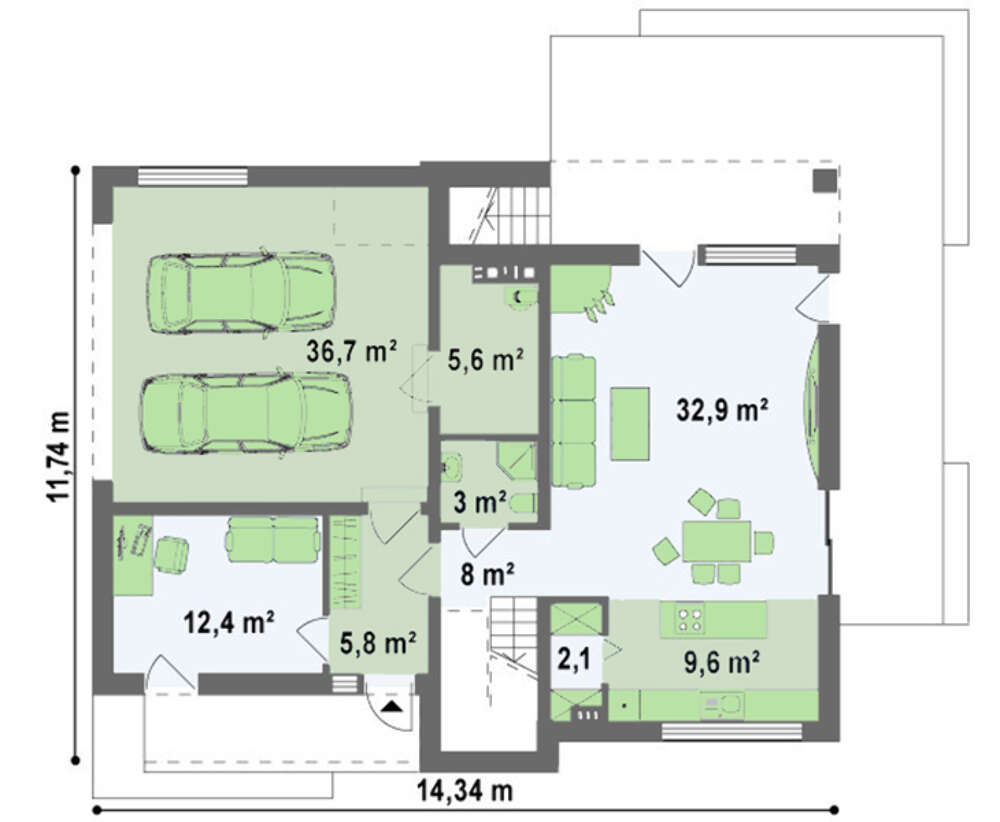 Проект современного коттеджа с террасой и гаражом для 2 авто